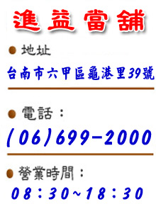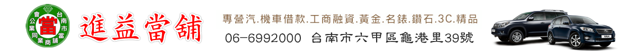 台南進益當舖經政府立案合法當舖,以提供客戶最有利、最便捷的服務為目的,專營:白河/佳里~當舖,汽車借款,機車借款,借錢等服務,專業化諮詢及透明化細節過程,無論是個人、公司行號都可享有利息優惠,不限金額,手續簡便,迅速撥款,有店面安全有保障、不論是大小額借款,都能快速週轉,讓您還得輕鬆無壓力。